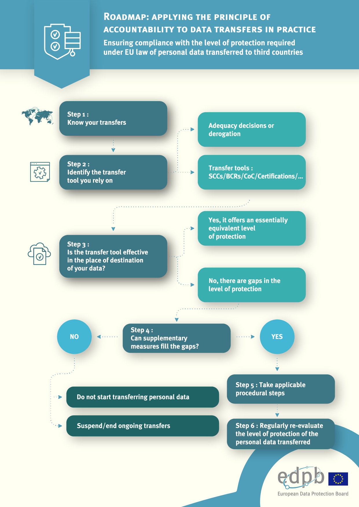 Vous considérez le transfert de données personnelles en dehors de l'UE? Suivez l'infographie développée par le Comité Européen de la Protection des données (aussi appelé EDPB) pour vous assurer de n'avoir manqué aucune étape :